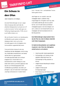 Veröffentlicht am 11. April 202516. März 2026 von zone210TVVS: Schuss in den Ofen Liebe Kolleginnen und Kollegen, der Arbeitgeber LHT veröffentlichte gestern seine Ideen und Angebote für die anstehenden TVVS-Verhandlungen. Unsere Reaktion darauf findet ihr in der Info.
