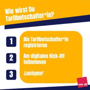 👉 Dann werde jetzt Tarifbotschafter*in, um die Forderungsbefragung und damit die Tarifrunde auch bei dir im Bereich ins Rollen zu bringen!